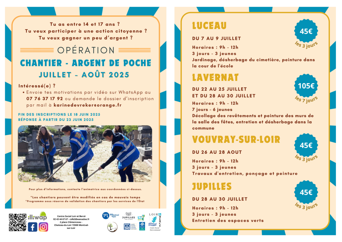 Tu as entre 14 et 17 ans et tu veux te faire un peu d’argent de poche tout en rendant service à ta commune ? C’est le moment de t’inscrire aux chantiers Argent de poche organisés par le Centre Social Loir et Bercé !