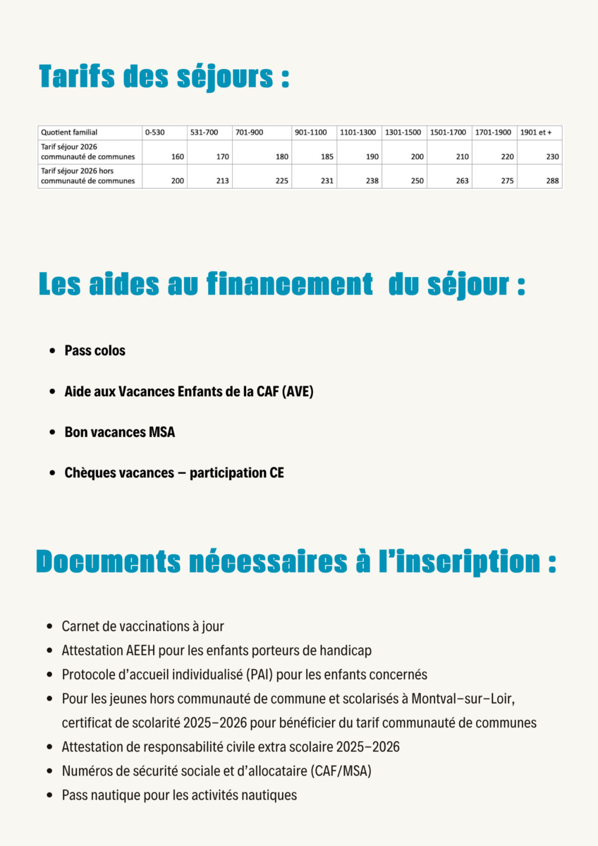 Début des inscriptions à la réunion d'informations le 10 avril 2026 à 18h30 au Centre de loisirs Rahart, puis à partir du 20 avril 2026 à 20h30 sur l'Espace Famille et à partir du 21 avril 2026 à 08h30 au secrétariat d'AGORA Loir et Bercé.