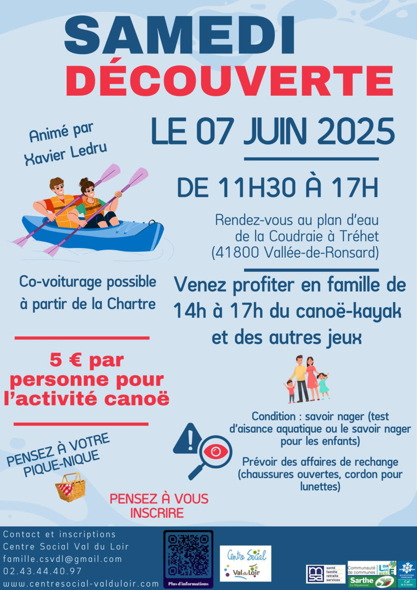 Le service famille a le plaisir de vous inviter au "samedi découverte", qui se tiendra le samedi 07 juin 2025. Nous vous donnons rendez-vous à 11h30 au plan d'eau de la Coudraie à Tréhet (41800 Vallée de Ronsard) afin de partager ensemble un pique-nique suivi d'une après-midi riche en activités. Au programme : canoë-kayak 🚣 et jeux en plein air ⚽🌳