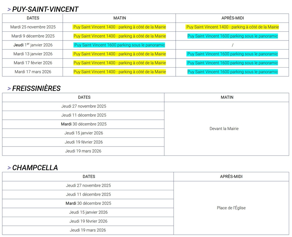 Comment prendre rendez-vousLe bus sera présent une semaine par mois sur le Nord du Département et assurera des permanences à Puy-Saint-Vincent, Freissinières et Champcella.