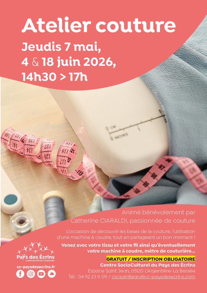 Un atelier couture animé bénévolement par Catherine CIARALDI, une passionnée de couture. L’occasion de découvrir les bases de la couture, l’utilisation d’une machine à coudre, tout en partageant un bon moment ! Venez avec votre tissu et votre fil ainsi qu’éventuellement votre machine à coudre, mètre de couturière... Vous apprendrez à confectionner de petite pièces uniques (trousses, sacs...)