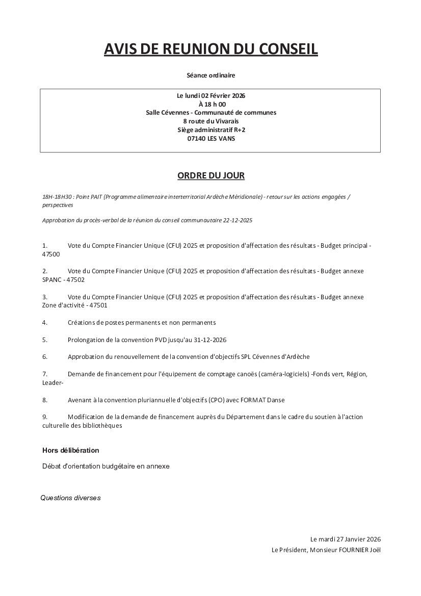 Voici l'ordre du jour du prochain conseil communautaire de la Communauté de communes du Pays des Vans en Cévennes