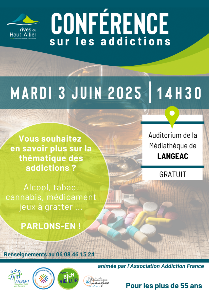 Animée par l’Association Addiction France, cette conférence vous permettra d’échanger librement sur ce sujet sensible et d’obtenir des informations utiles.