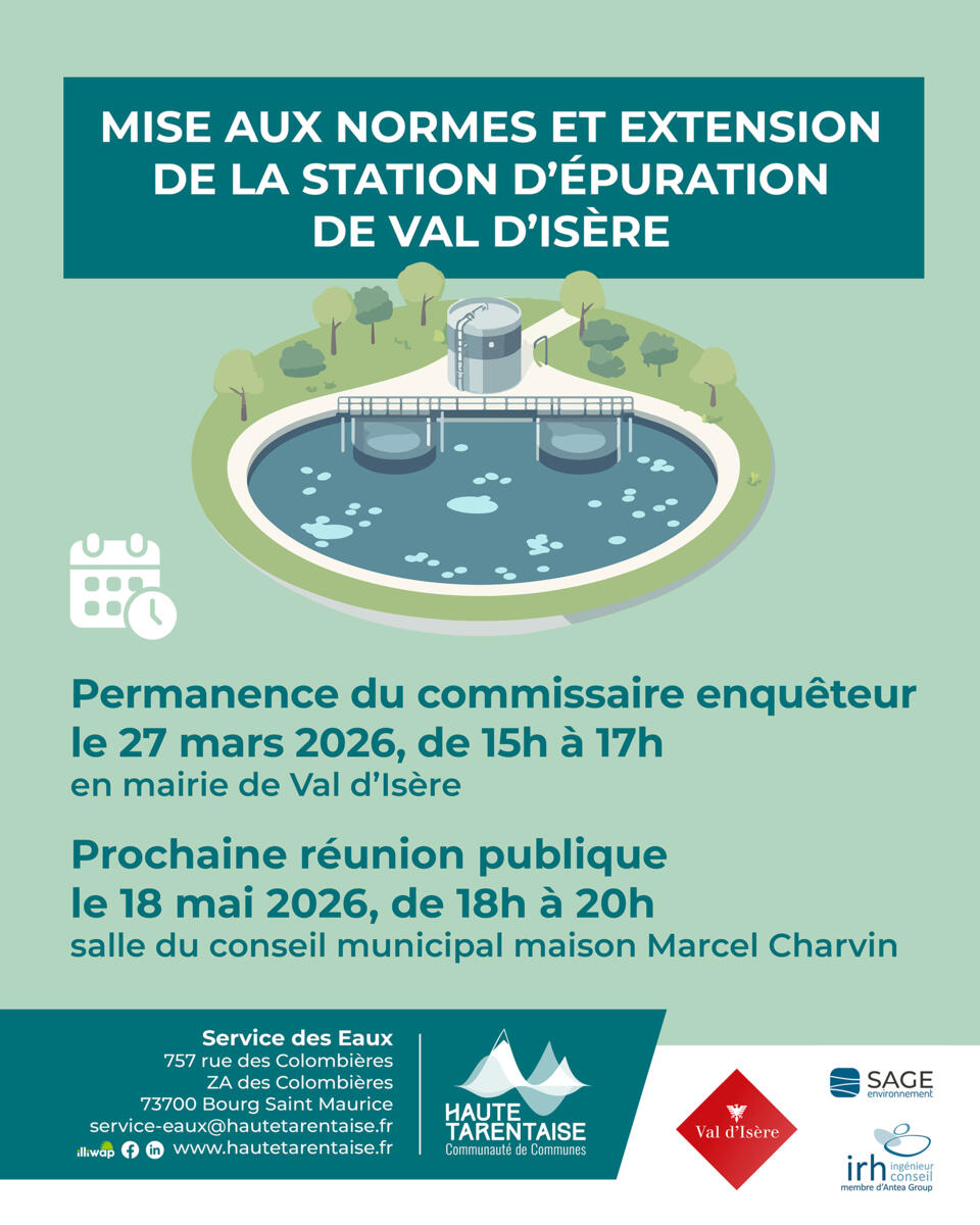 Dans le cadre de la consultation du public pour les travaux de mise aux normes et d'extension de la station d’épuration de Val d’Isère, le service des Eaux de la communauté de communes de Haute Tarentaise vous informe des prochaines dates clés :