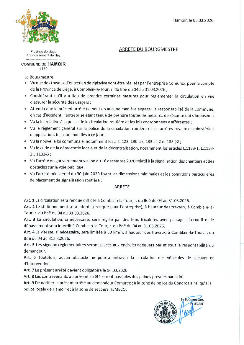 Arrêté du Bourgmestre - Comblain-la-Tour 05/03/2026 Travaux d'abattage r. du Boë à Comblain-la-Tour du 04 au 31.03.2026.