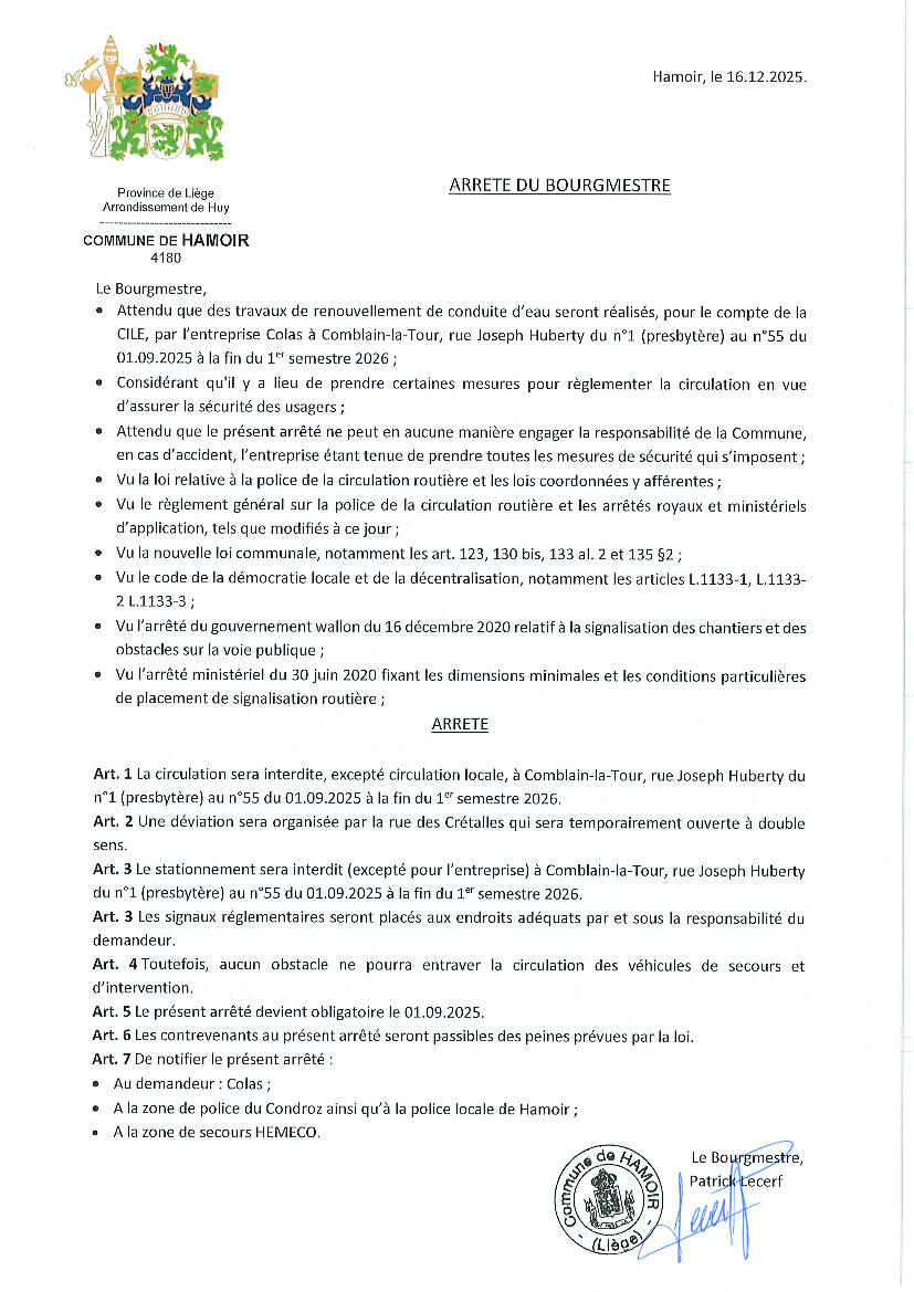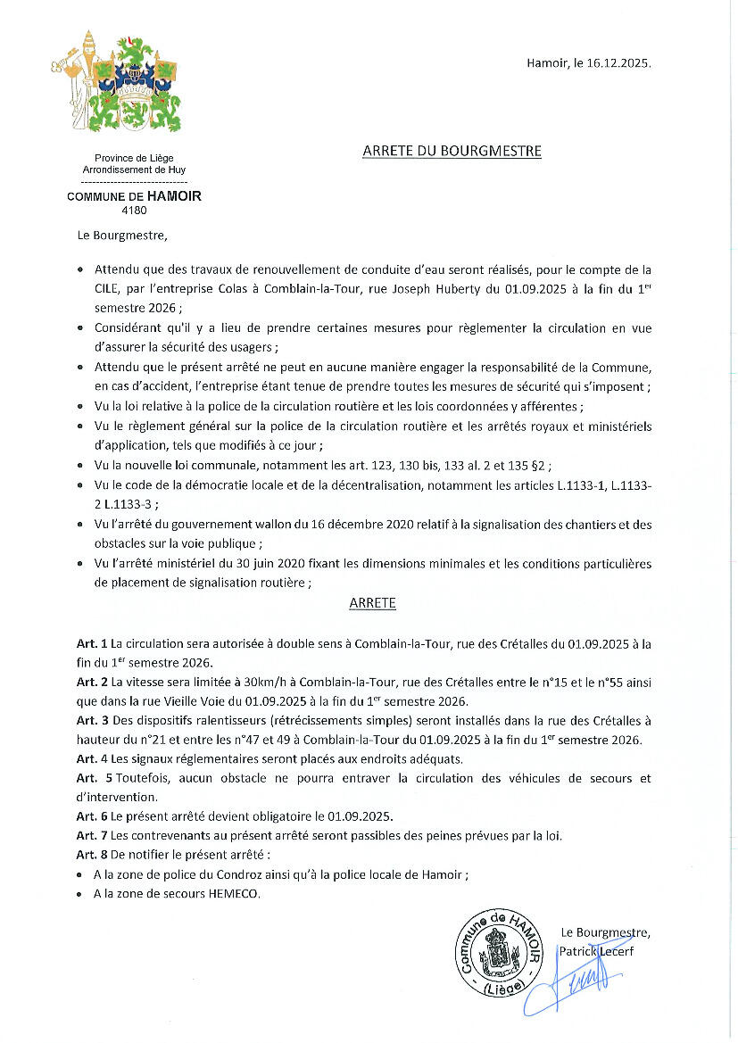 Comme vous le savez, d’importants travaux sont réalisés à Comblain-la-Tour, rue Joseph Huberty.