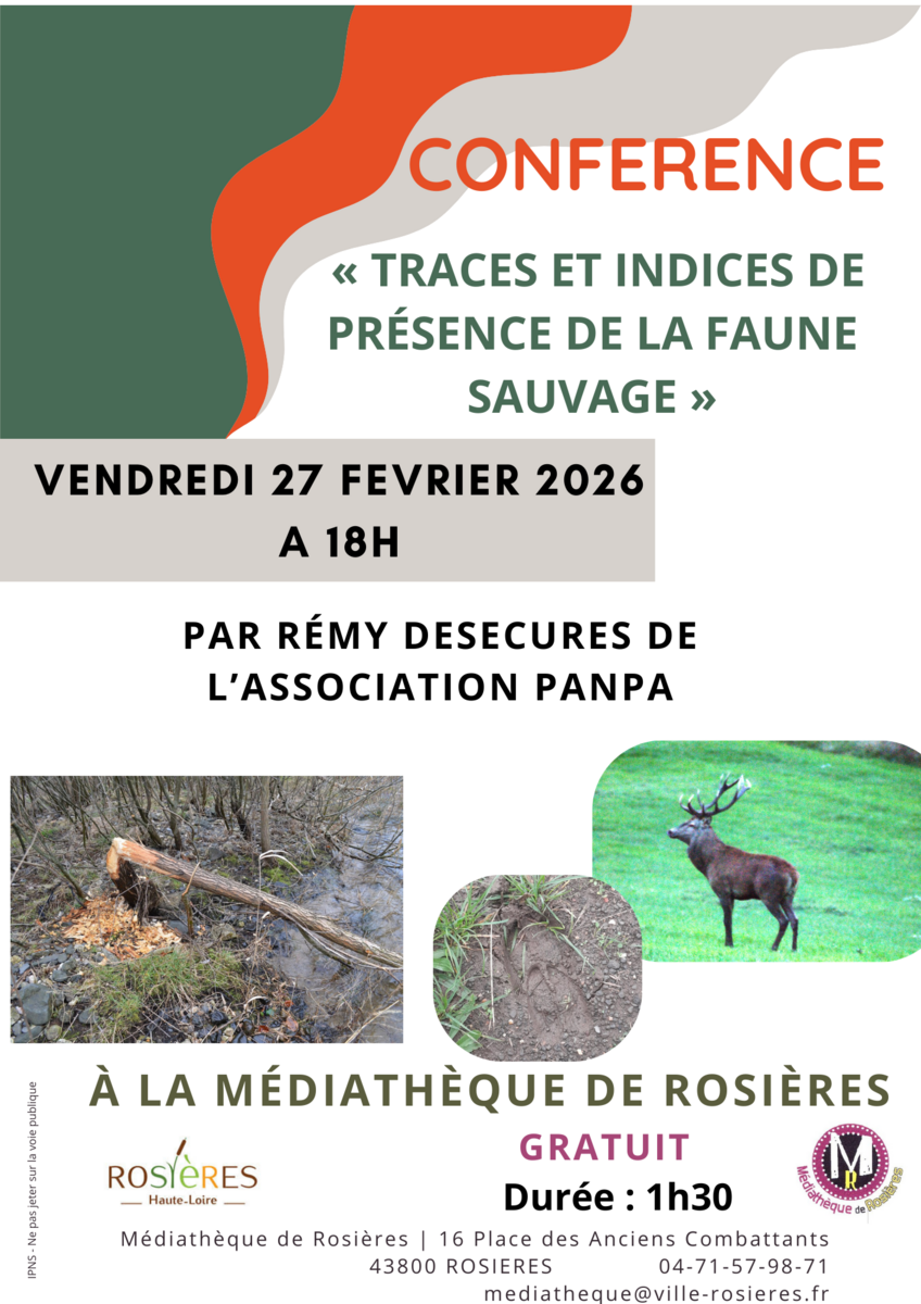 Conférence À Rosières "Les Traces D'animaux Sur Le Chemin" 25/02/2026 Vendredi 27 février à 18h à la médiathèque de Rosières. Renseignements : 0471579871 ou mediatheque@ville-rosieres.fr