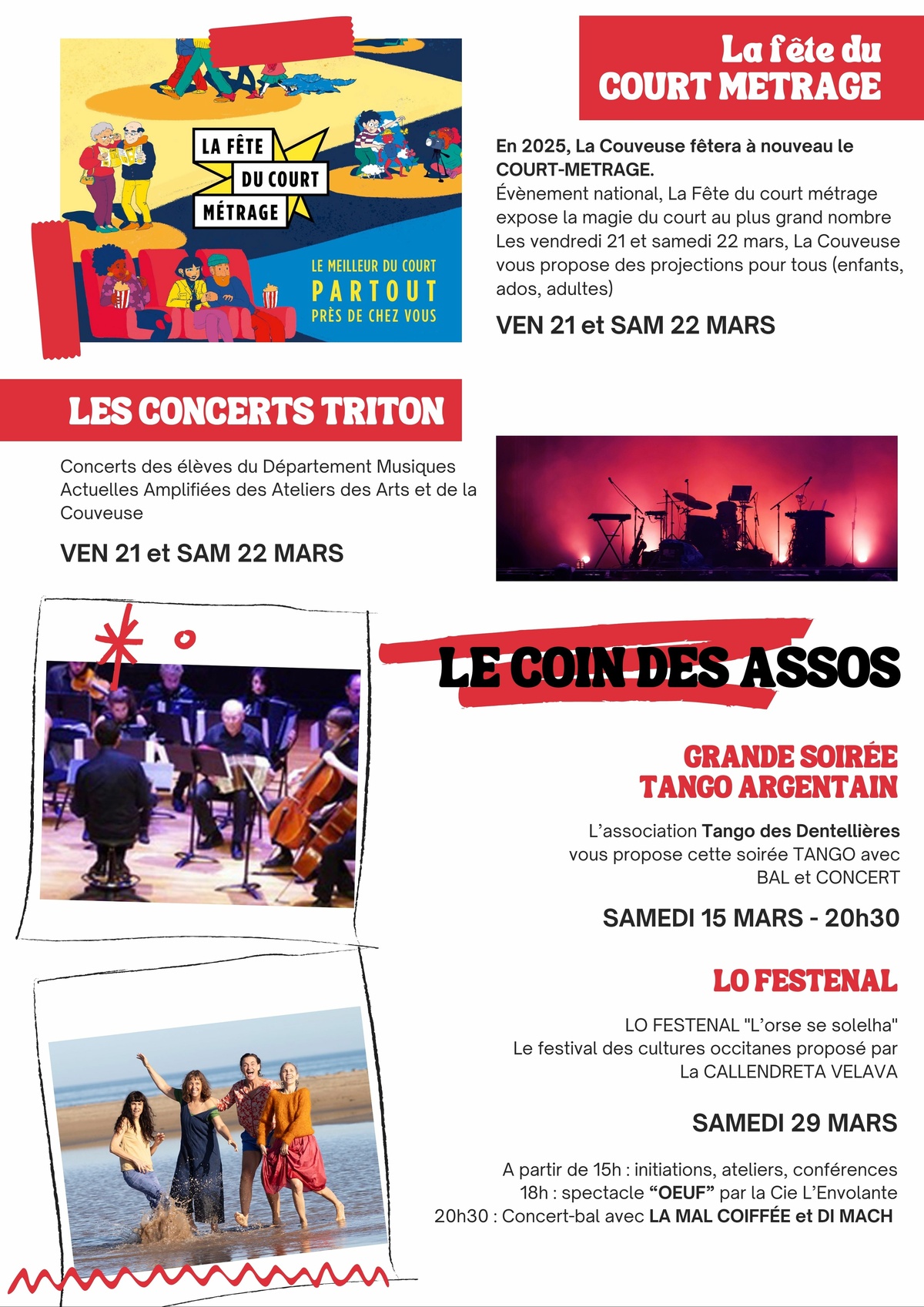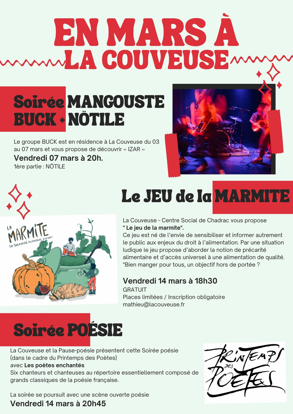 Retrouvez la lettre d'infos du mois de mars et tous les RDV à ne pas manquer à La Couveuse (Pôle culturel)