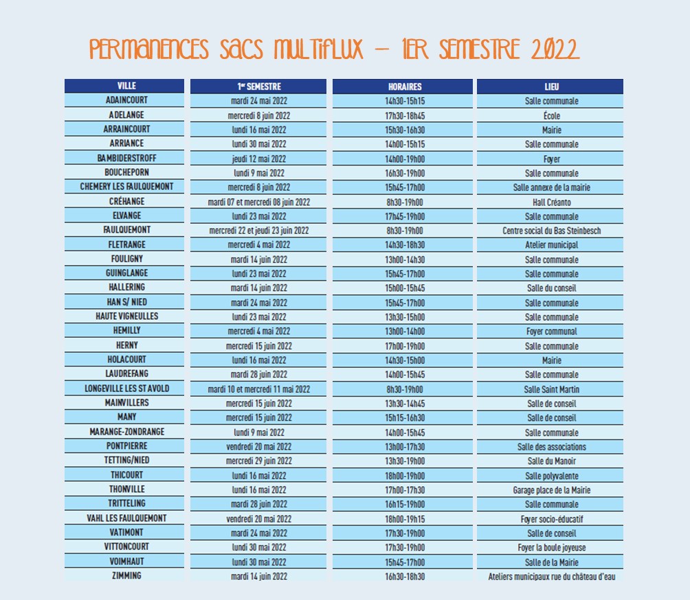 Reprise des redotations en sacs multiflux mai/juin 2022 03/05/2022 Le SYDEME se déplace dans votre commune en mai et juin pour les redotations en sacs multiflux. Retrouvez sur le lien ci-dessous la liste complète des dotations par commune.