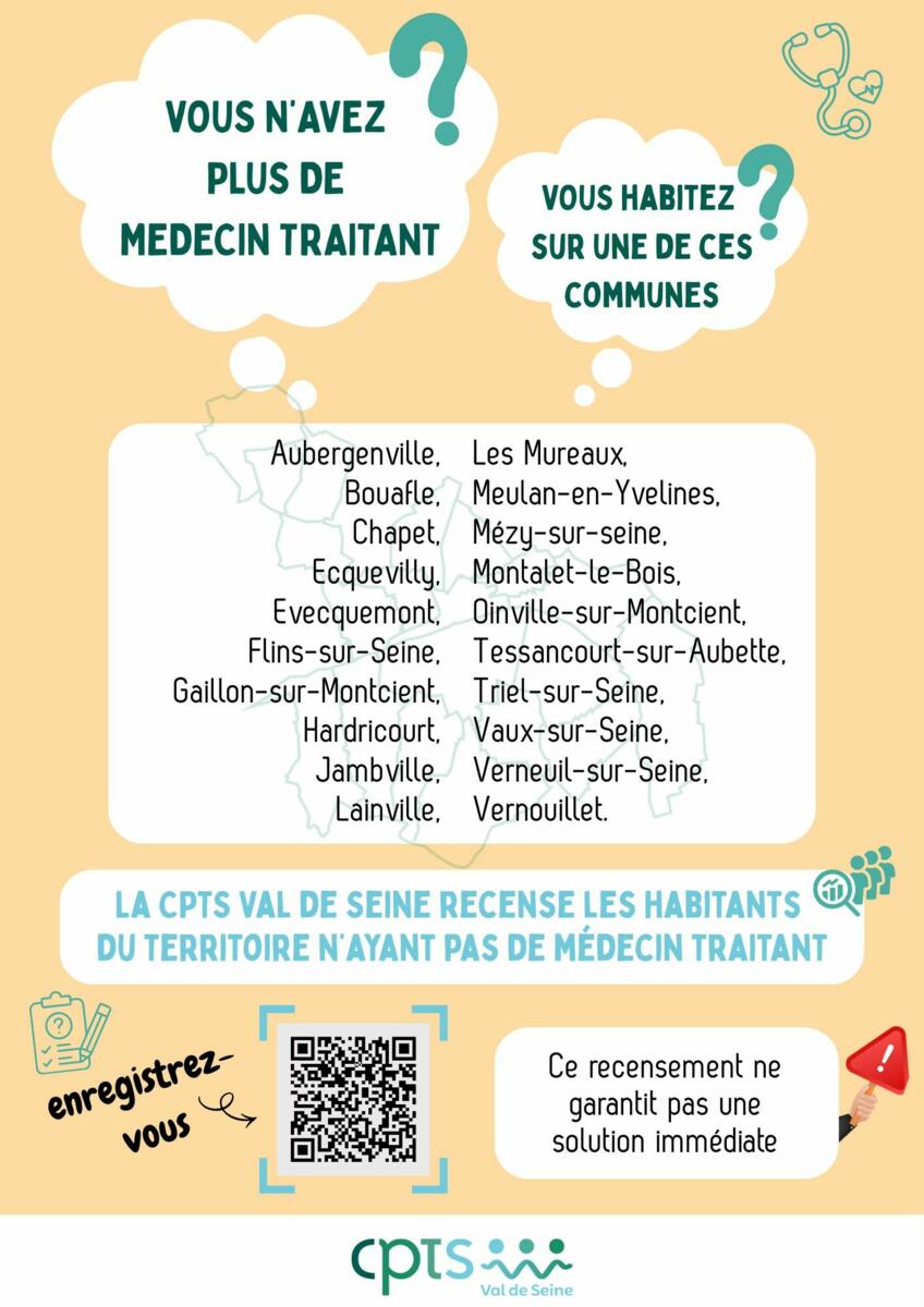 ℹ La CPTS Val de Seine lance une initiative locale pour mieux repérer les habitants du territoire qui sont actuellement sans médecin traitant.