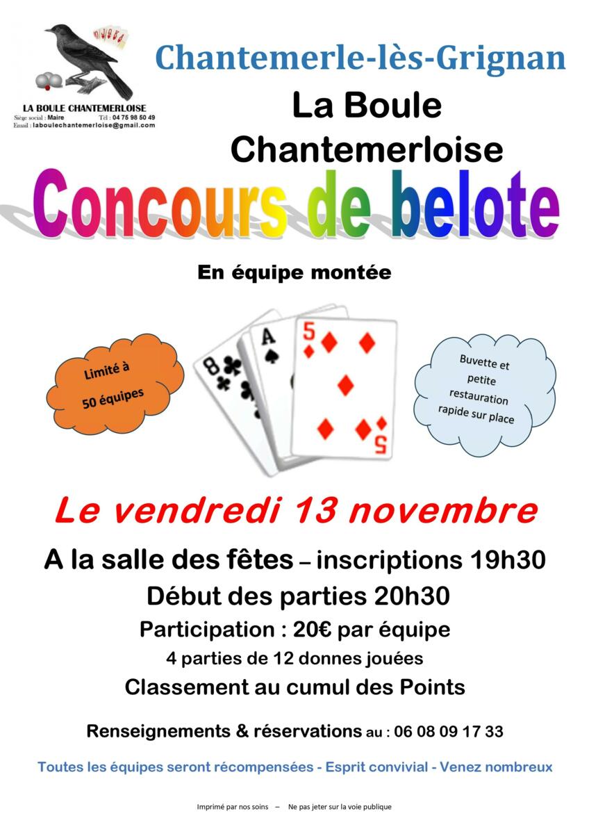 Traditionnel concours de belote en équipe montée ouvert à tous. En 4 parties de 12 donnes jouées sans annonce. Classement au cumul des points faits. Inscriptions dés 19h30.