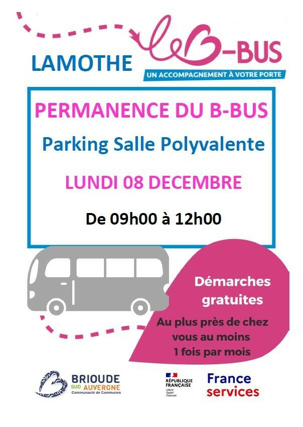 Permanence Du B-Bus Le Lundi 08 Décembre 2025 27/11/2025 de 9h à 12h sur le parking de la salle polyvalente
