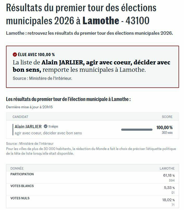 Le scrutin municipal de Lamothe a rendu son verdict. Malgré l'enjeu particulier d'une liste unique, les Lamothois se sont mobilisés pour confirmer leur confiance à l'équipe sortante et aux nouveaux candidats.