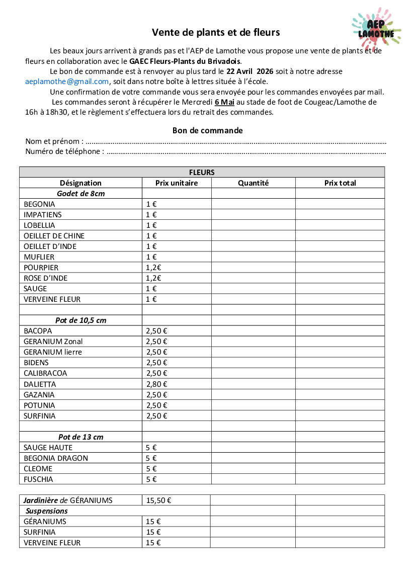 Le bon de commande est à renvoyer au plus tard le 22 Avril 2026 soit à notre adresse aeplamothe@gmail.com, soit dans notre boîte à lettres située à l’école.
