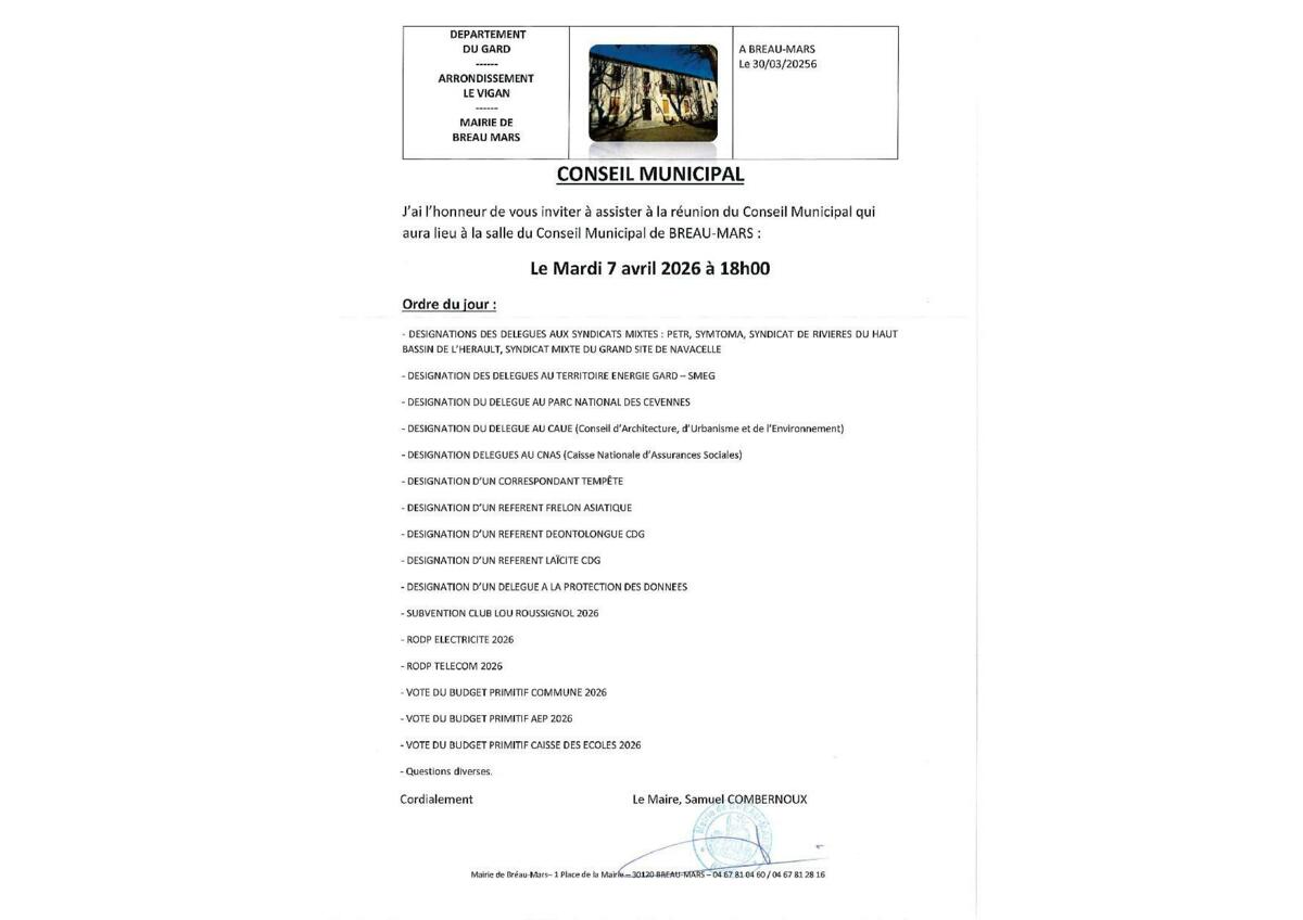 Le prochain Conseil Municipal aura  lieu le mardi 7 avril 2026 à 18h à la salle du conseil municipal en Mairie de BREAU-MARS.