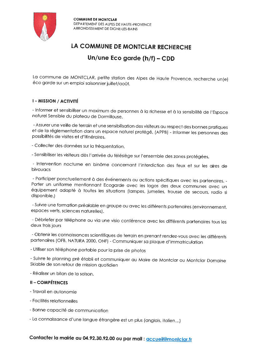 LA COMMUNE DE MONTCLAR RECHERCHE UN/UNE ECO GARDE