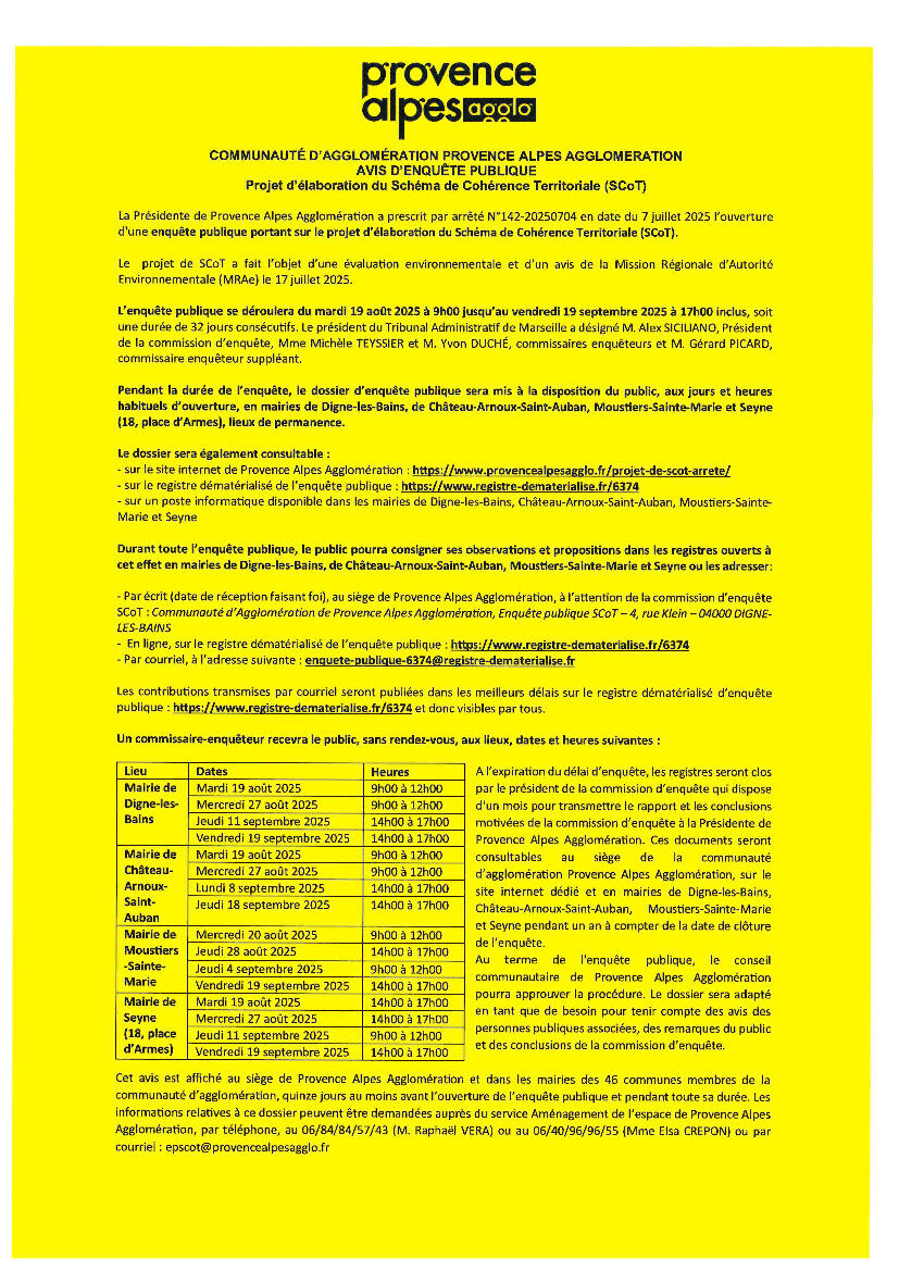 La Présidente de Provence Alpes Agglomération ouvre une enquête publique portant sur le projet d'élaboration du Schéma de Cohérence Territoriale (SCoT).