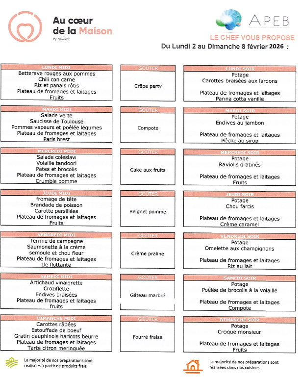 / Menu du lundi 2 au dimanche 8 février 2026