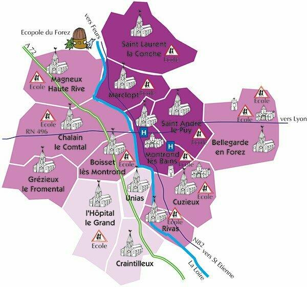 Montrond-les-Bains, Bellegarde-en-Forez, Cuzieu, Saint-André-le-Puy, Craintilleux, Boisset-lès-Montrond, L'Hôpital-le-Grand, Saint-Laurent-la-Conche, Chalain-le-Comtal, Rivas, Marclopt, Magneux-haute-rive, Unias, Grézieux-le-Fromental.