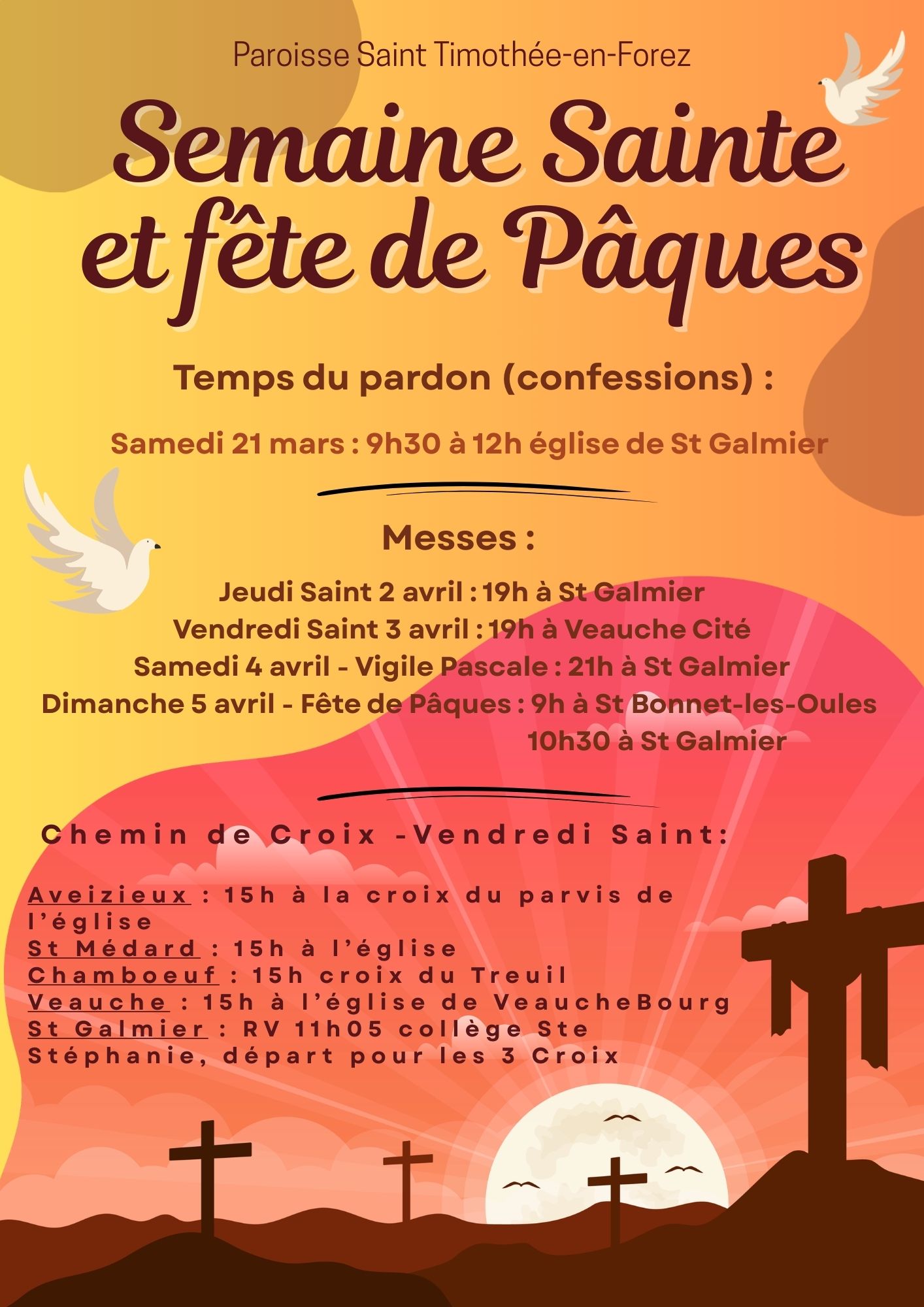 – Jeudi-Saint 2 avril à 19h : église de Saint-Galmier, messe pour nos 3 paroisses.