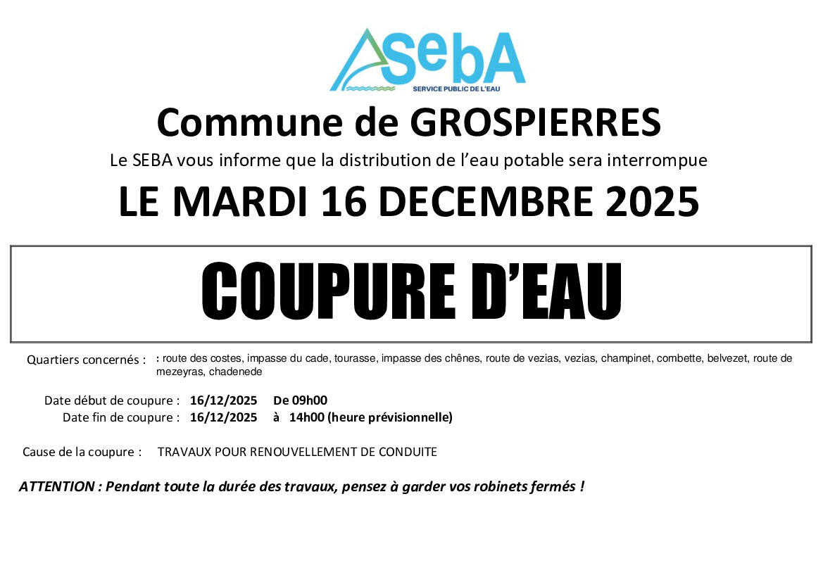 AVIS DE COUPURE D'EAU GROSPIERRES LE 16/12/2025