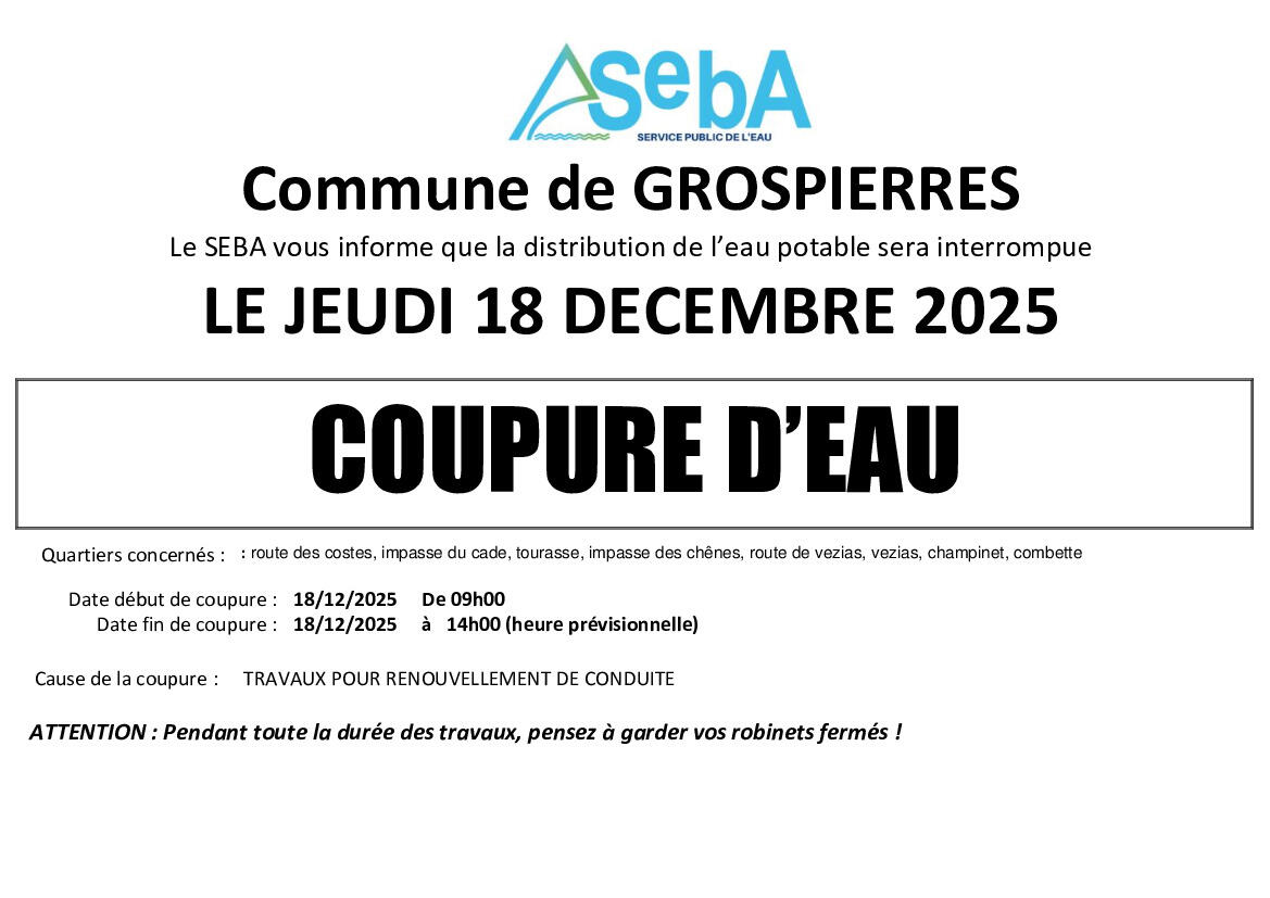 AVIS DE COUPURE D'EAU GROSPIERRES LE 18/12/2025