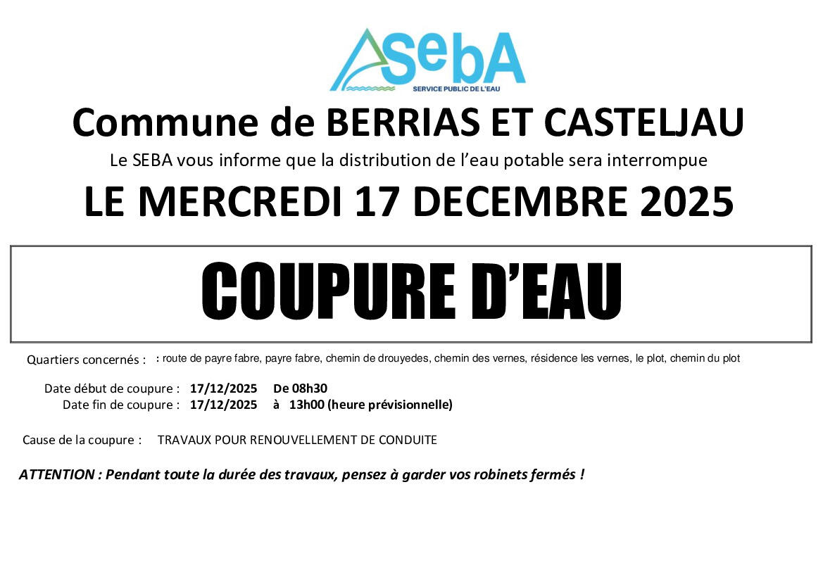 AVIS DE COUPURE D'EAU BERRIAS ET CASTELJAU LE 17/12/2025