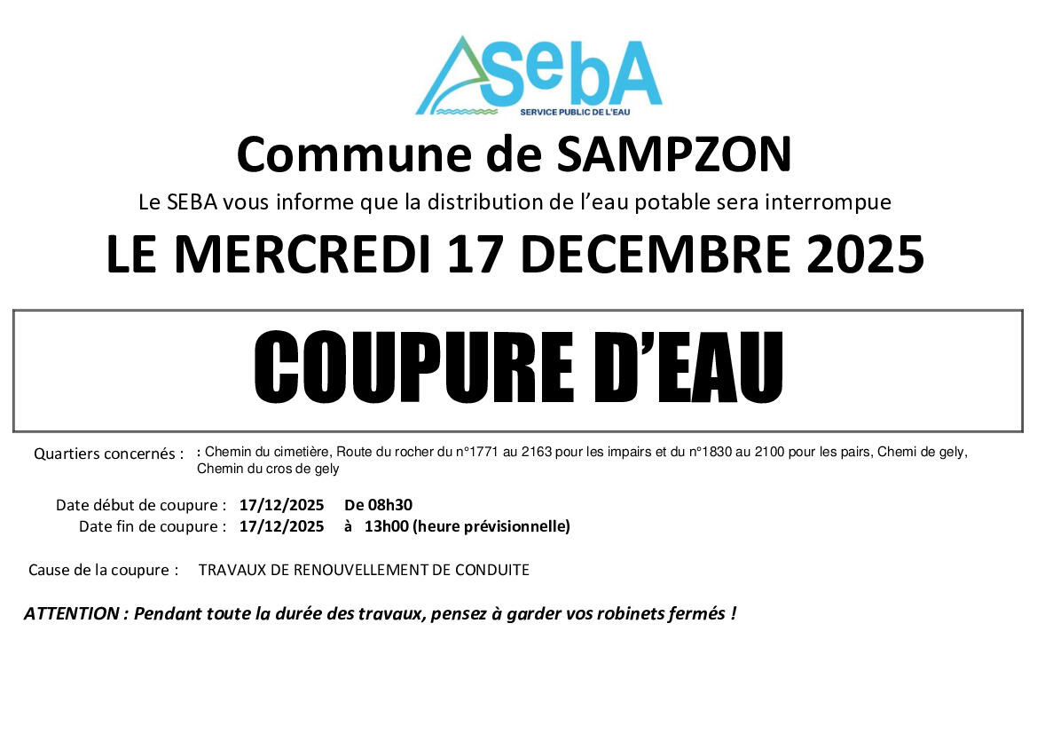 AVIS DE COUPURE D'EAU SAMPZON LE 17/12/2025