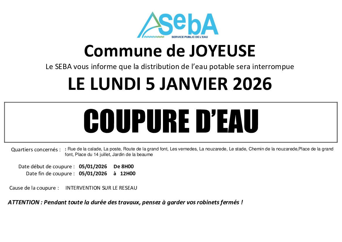 AVIS DE COUPURE D'EAU JOYEUSE LE 05/01/2026