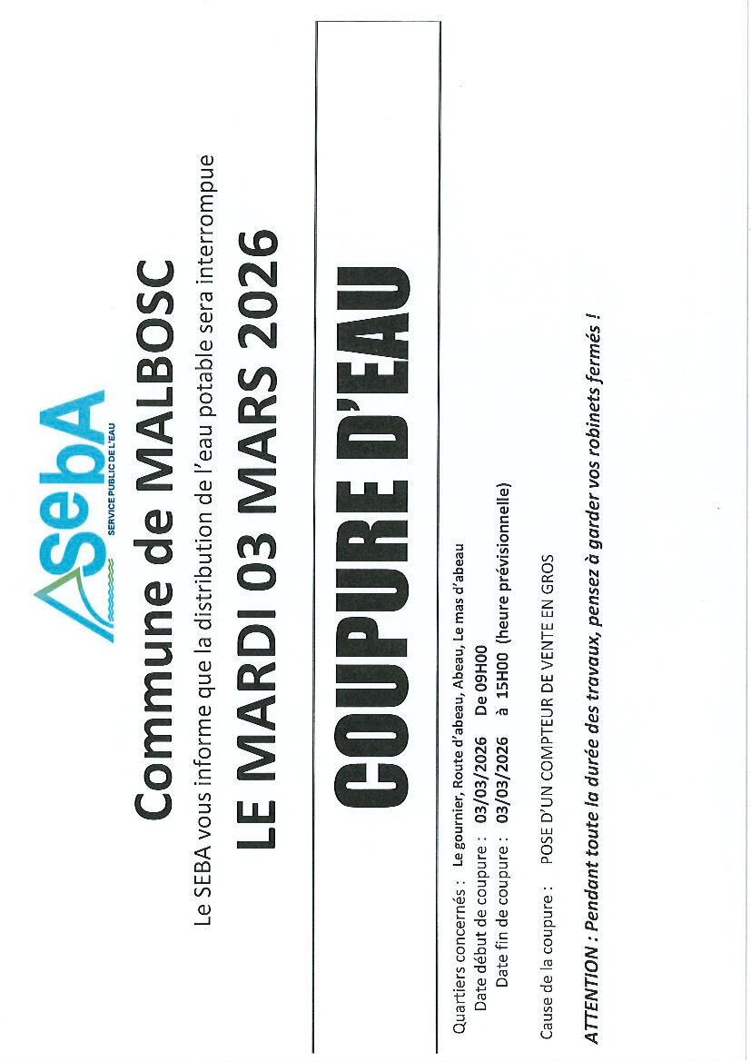 AVIS DE COUPURE D'EAU MALBOSC 03/03/2026