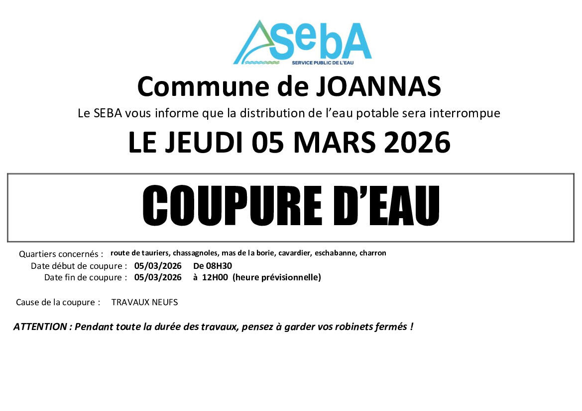 AVIS DE COUPURE D'EAU JOANNAS LE 05/03/2026