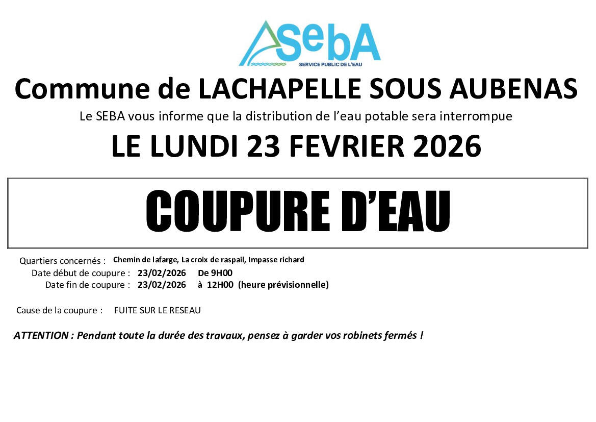 AVIS DE COUPURE D'EAU LACHAPELLE SOUS AUBENAS LE 23/02/2026