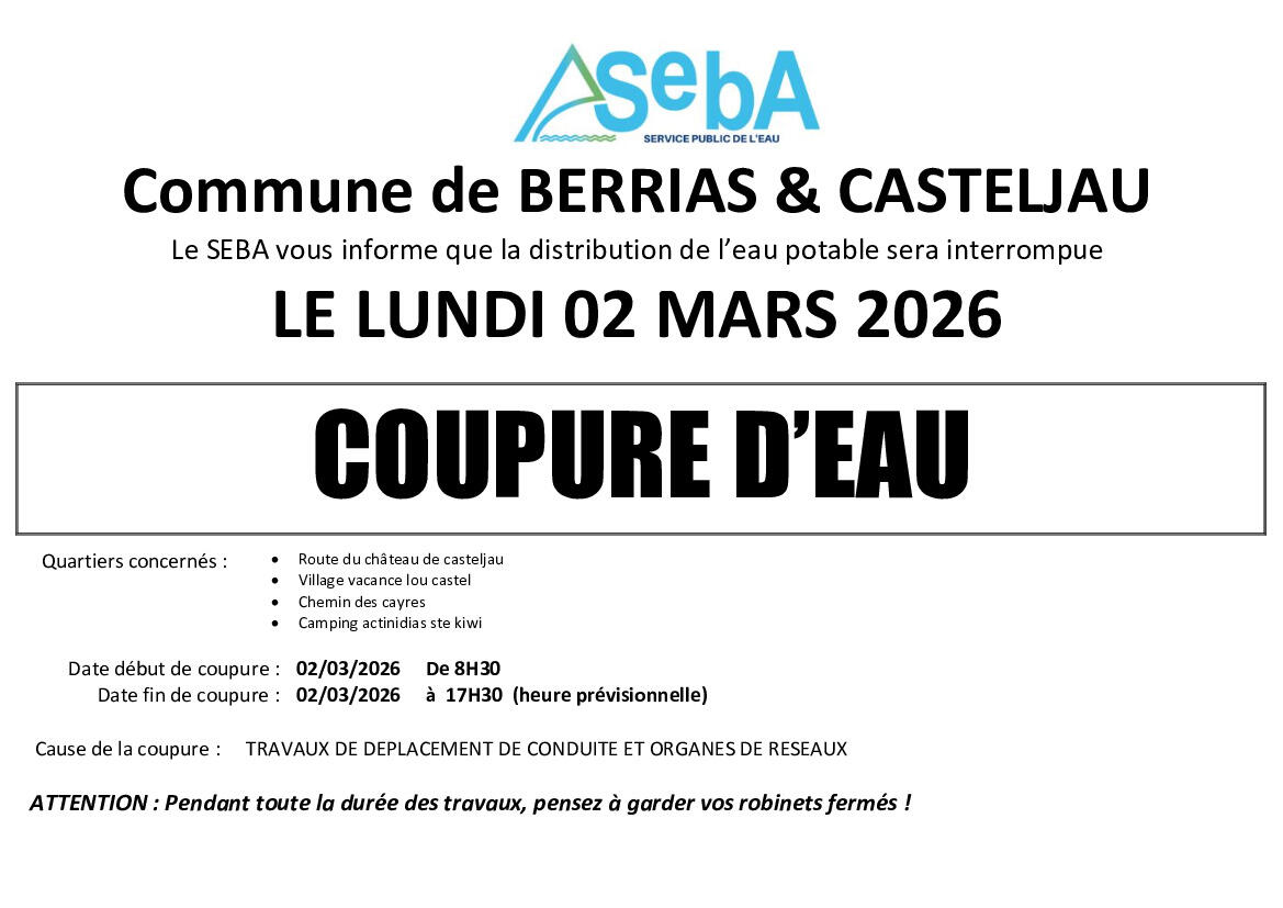 AVIS DE COUPURE D'EAU BERRIAS ET CASTELJAU 02/03/26