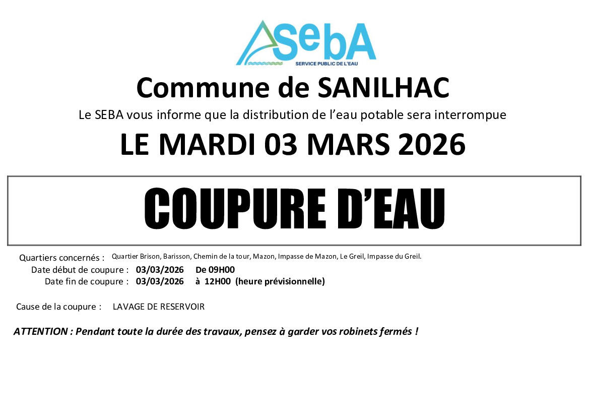 AVIS DE COUPURE D'EAU SANILHAC LE 03/03/2026