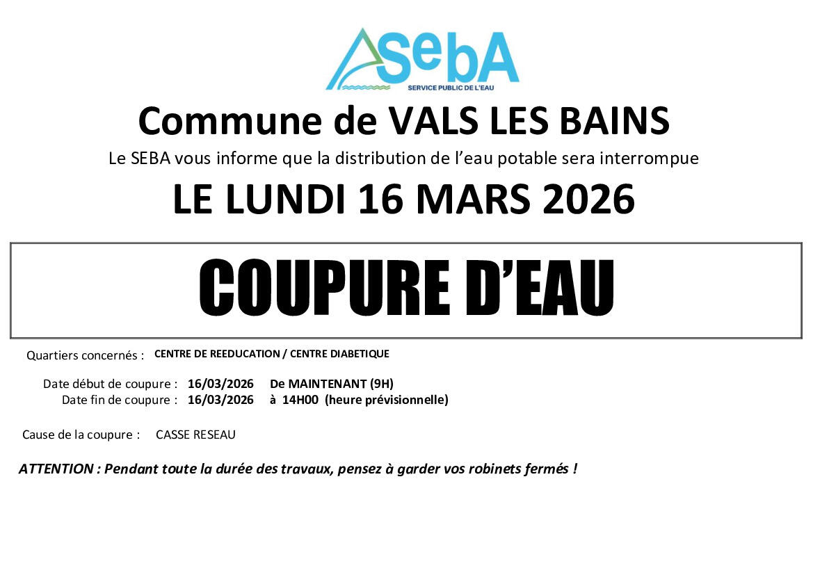 AVIS DE COUPURE D'EAU VALS LES BAINS 16/03/2026 16/03/2026 AVIS DE COUPURE D'EAU VALS LES BAINS 16/03/2026