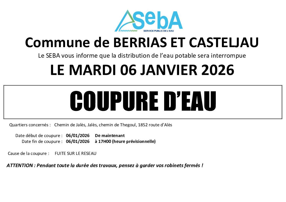 AVIS DE COUPURE D'EAU BERRIAS ET CASTELJAU 06/01/2025 06/01/2026 AVIS DE COUPURE D'EAU BERRIAS ET CASTELJAU 06/01/2025
