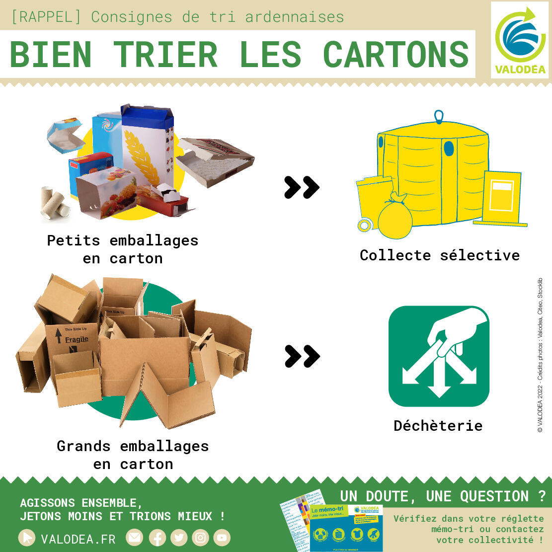 Dans mon bac de tri je mets mes emballages ménagers et mes papiers d'écriture et de lecture, mes grands cartons vont en déchèterie et si je suis une entreprise, je mets la même chose qu'à la maison, rien de plus.