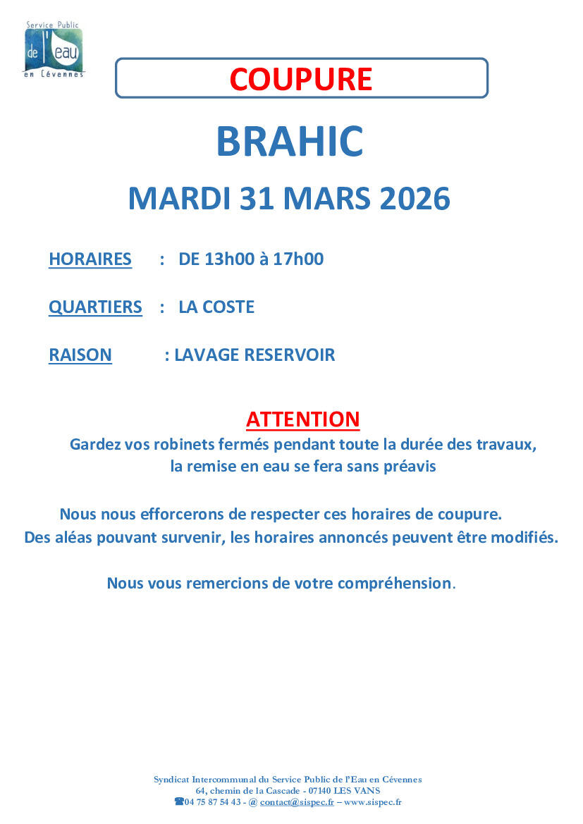 Avis De Coupure Brahic Le 31/03/2026