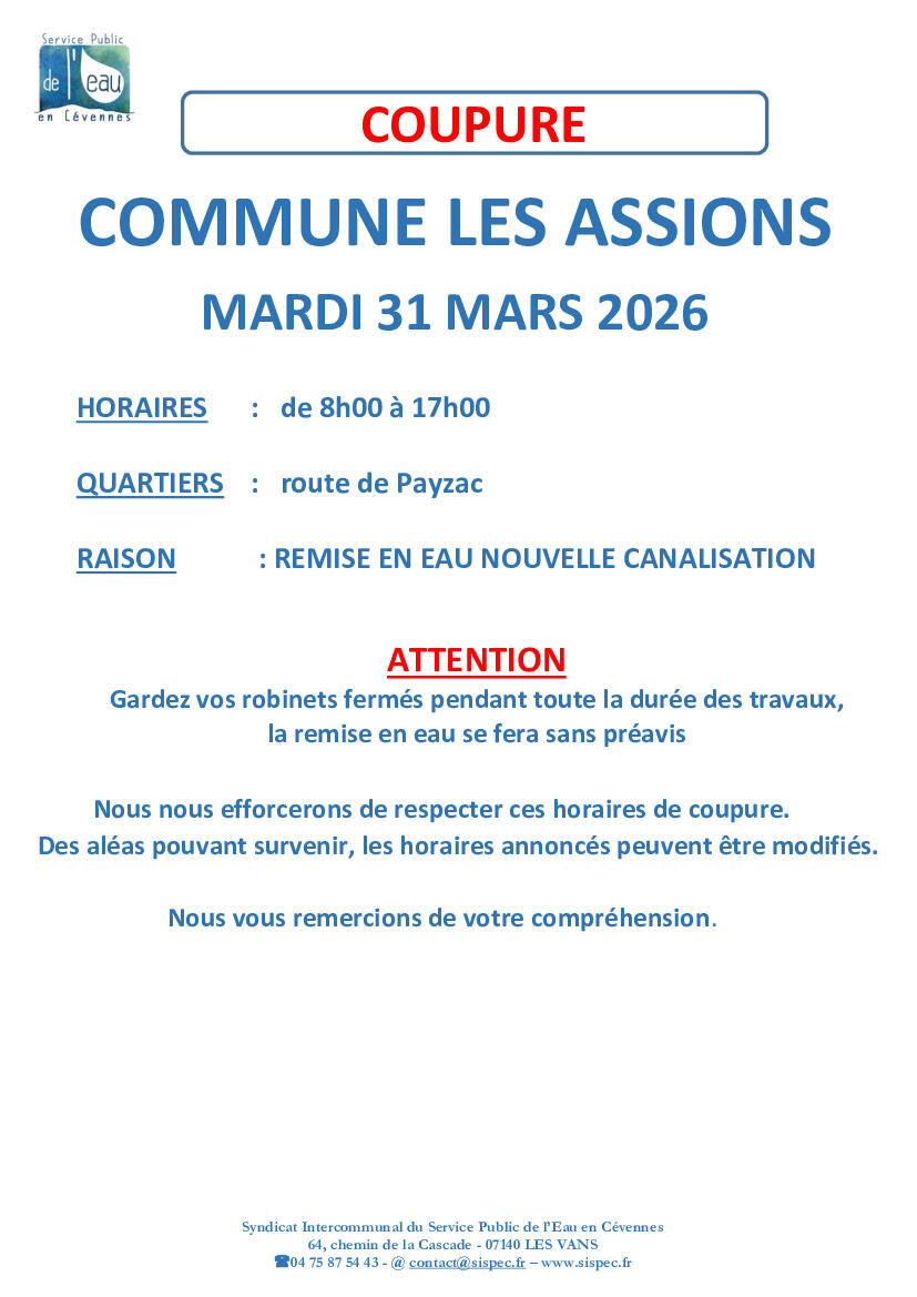 AVIS DE COUPURE LES ASSIONS LE 31/03/2026
