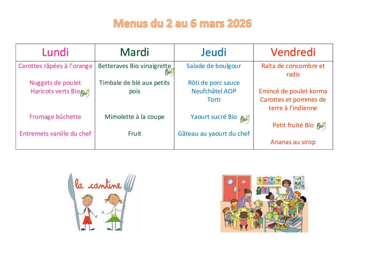 Menus cantine du 16 au 20 mars 2026