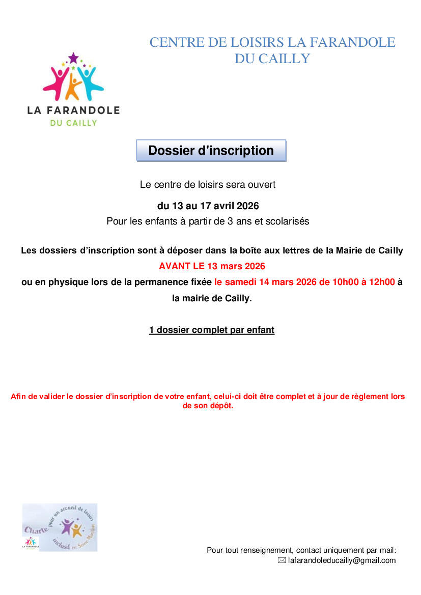 Nous avons le plaisir de vous informer que les inscriptions sont ouvertes pour le Centre de Loisirs LA FARANDOLE DU CAILLY, qui se déroulera du 13 au 17 avril 2026.