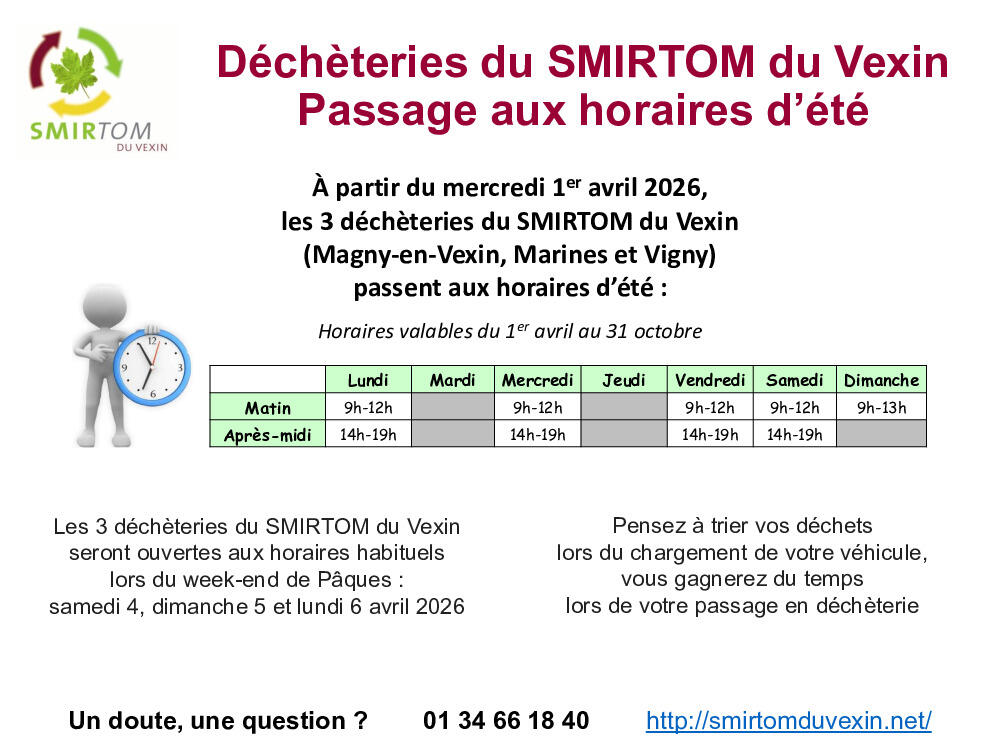 SMIRTOM du Vexin - Mercredi 1er avril 2026 horaires d'été