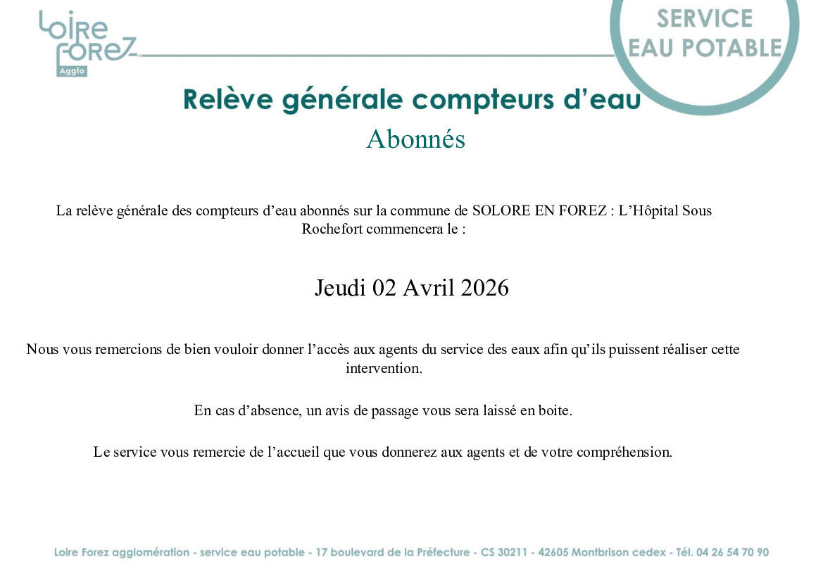 Relève générale des compteurs d'eau 02/04/2026