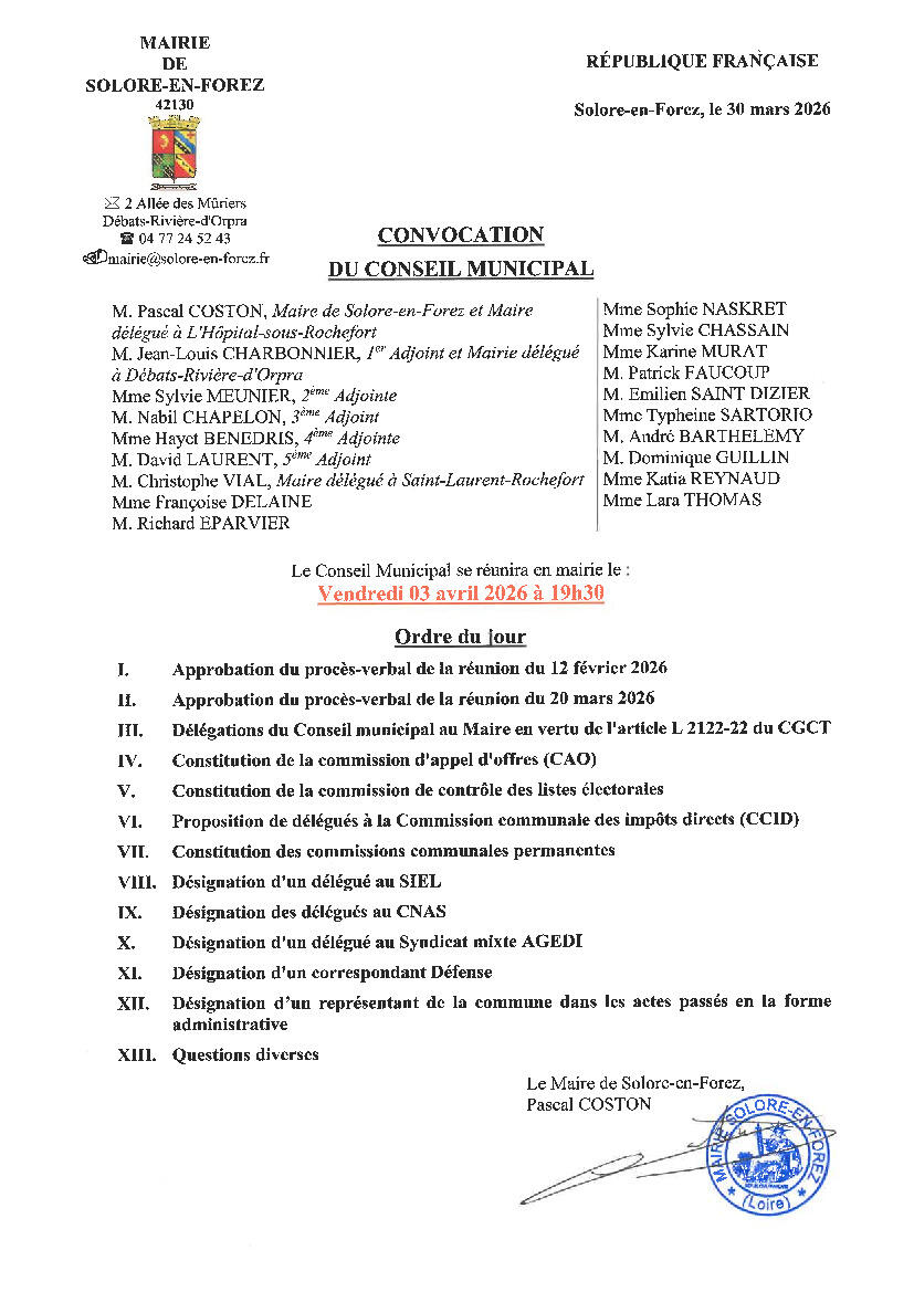 Vendredi 03 avril 2026 à 19h30 (convocation affichée en mairie le 30 mars 2026)