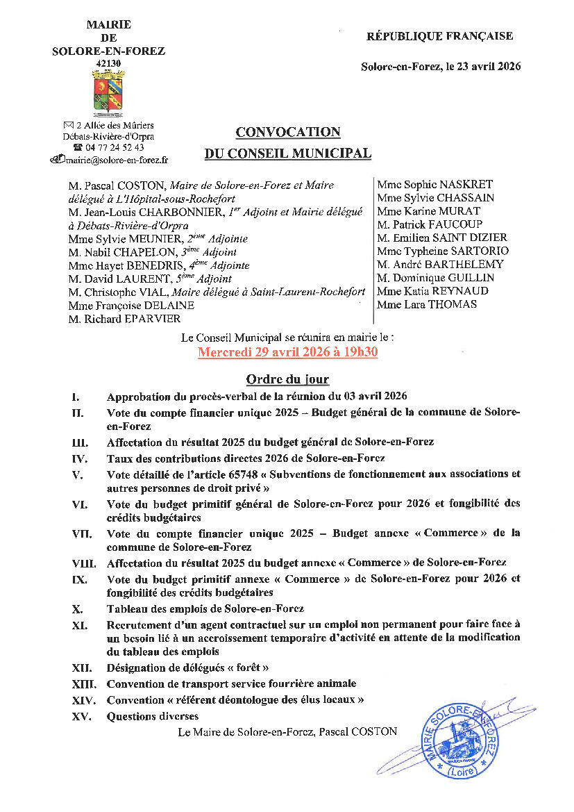 La prochaine réunion du Conseil municipal aura lieu le mercredi 29 avril 2026 à 19h30 en salle du Conseil de la Mairie principale de Solore-en-Forez.