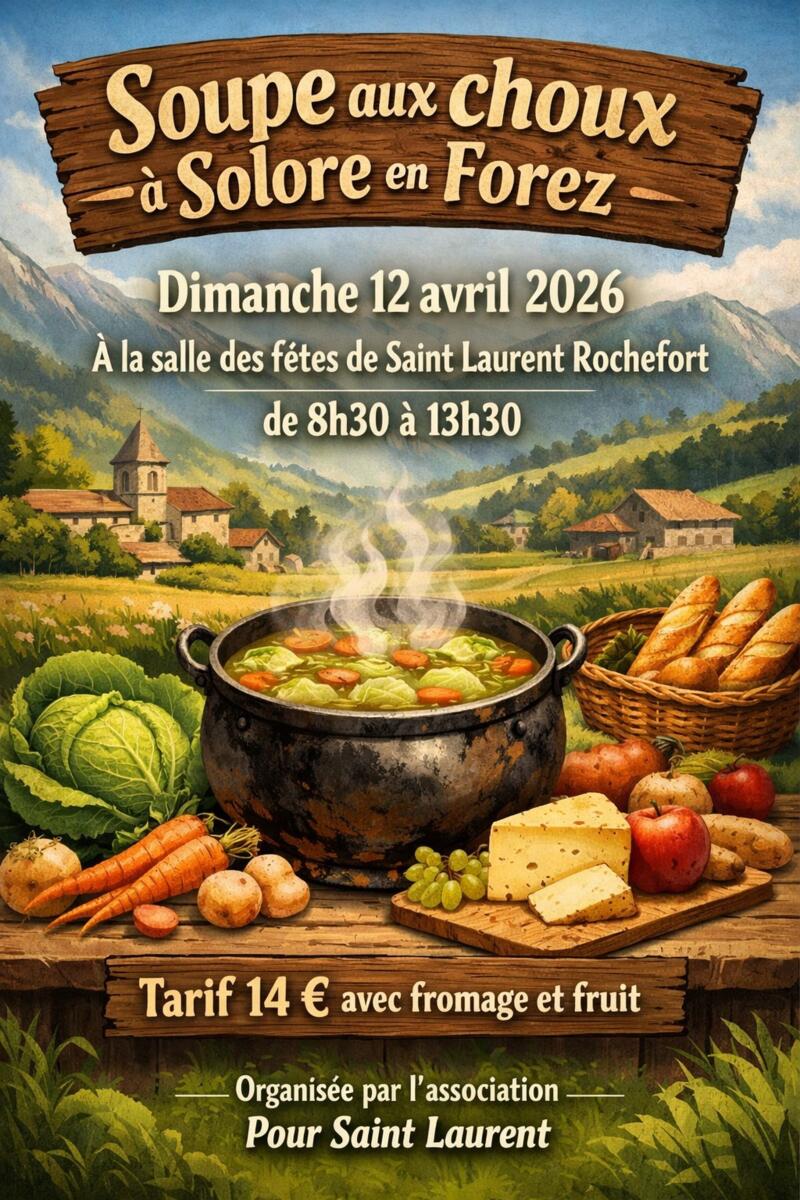 L'association "Pour Saint-Laurent" organise une soupe aux choux à la salle des fêtes de Saint-Laurent-Rochefort le dimanche 12 avril 2026 de 8h30 à 13h30. Tarif 14€ avec formage et fruit.