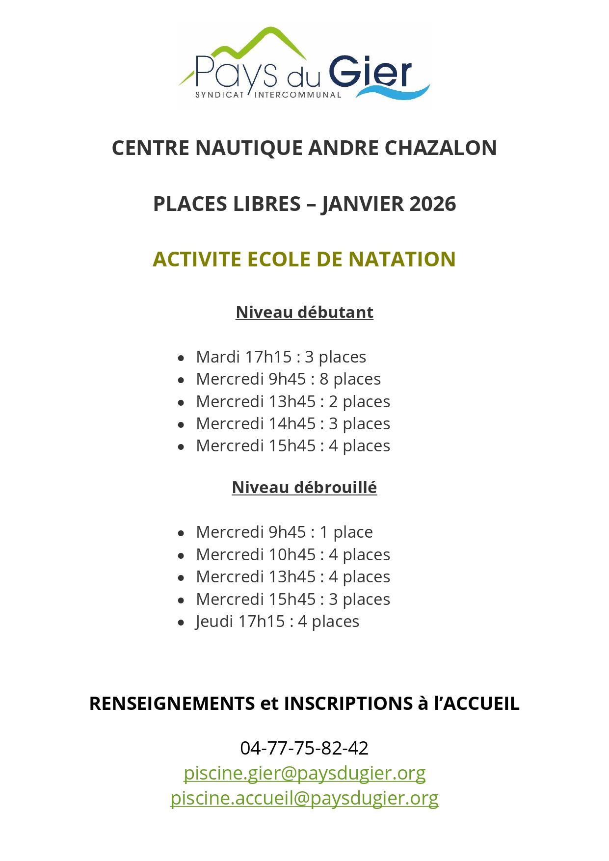 Places libres - cours de natation pour enfants 07/01/2026 Des places se sont libérées en Ecole de Natation. C'est le moment d'en profiter !