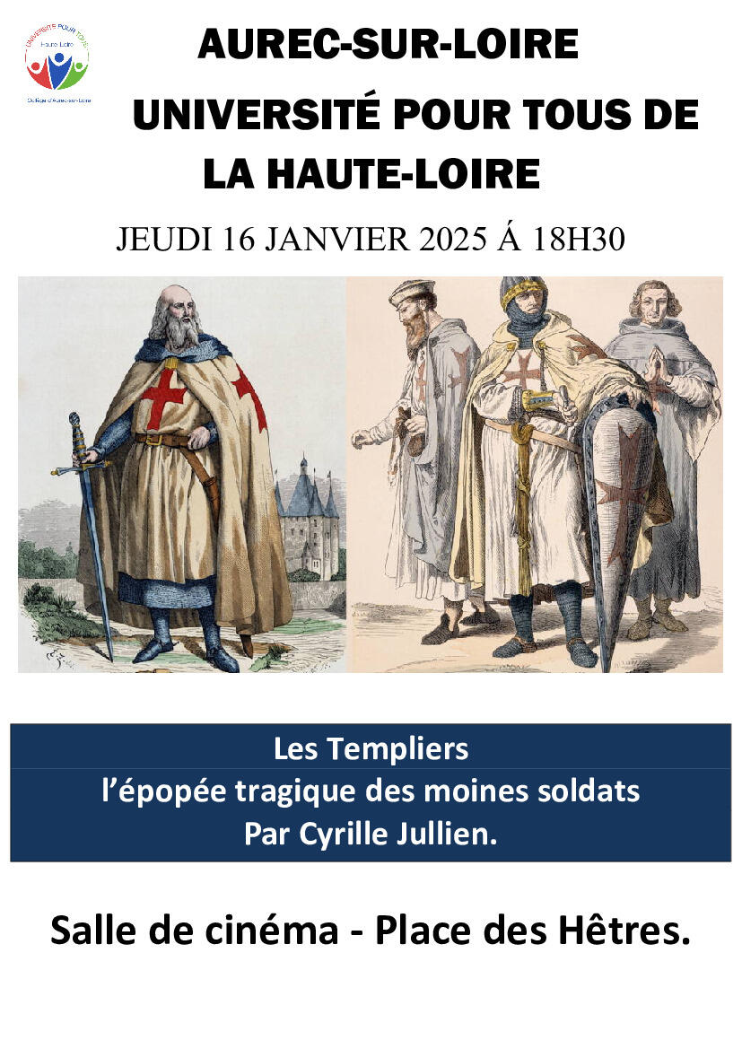 Cette conférence se propose de revenir sur l'origine et sur la nature de l'ordre des Templiers, de dévoiler leur fabuleux patrimoine, qui s’étend des majestueuses forteresses du Proche-Orient aux commanderies et chapelles qui parsèment les régions de France. Elle s’interrogera également sur les raisons de leur chute et sur les légendes qu’elle a entraînée, de la condamnation des « rois maudits » par Jacques Molay, dernier grand maître du Temple, à la recherche du fabuleux (et supposé) trésor caché des moines-soldats.