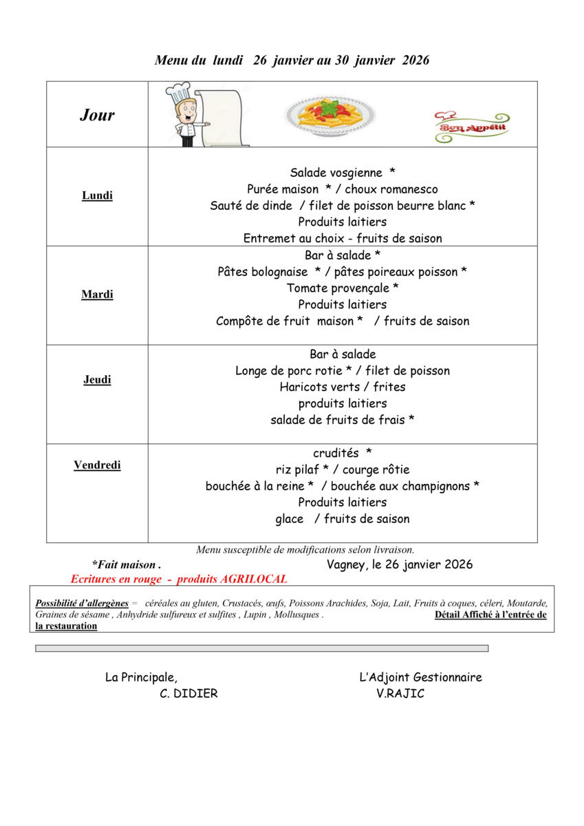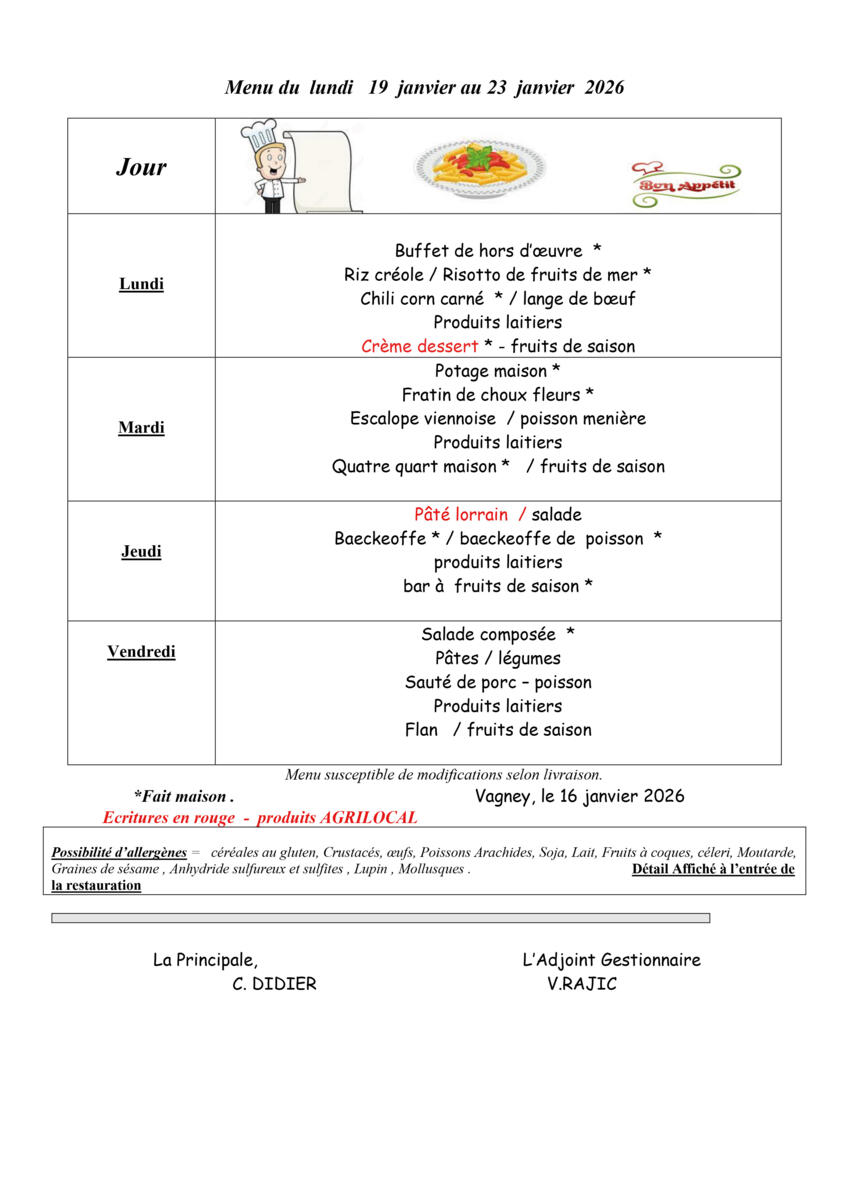 Menu de la cantine