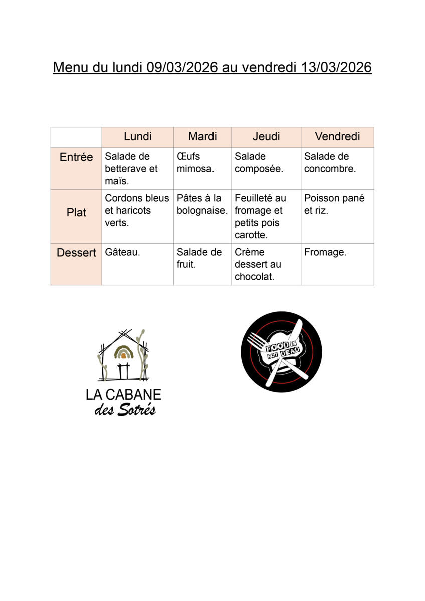Les menus de la cantine (collège et petits) pour la semaine du 09 au 13 mars.